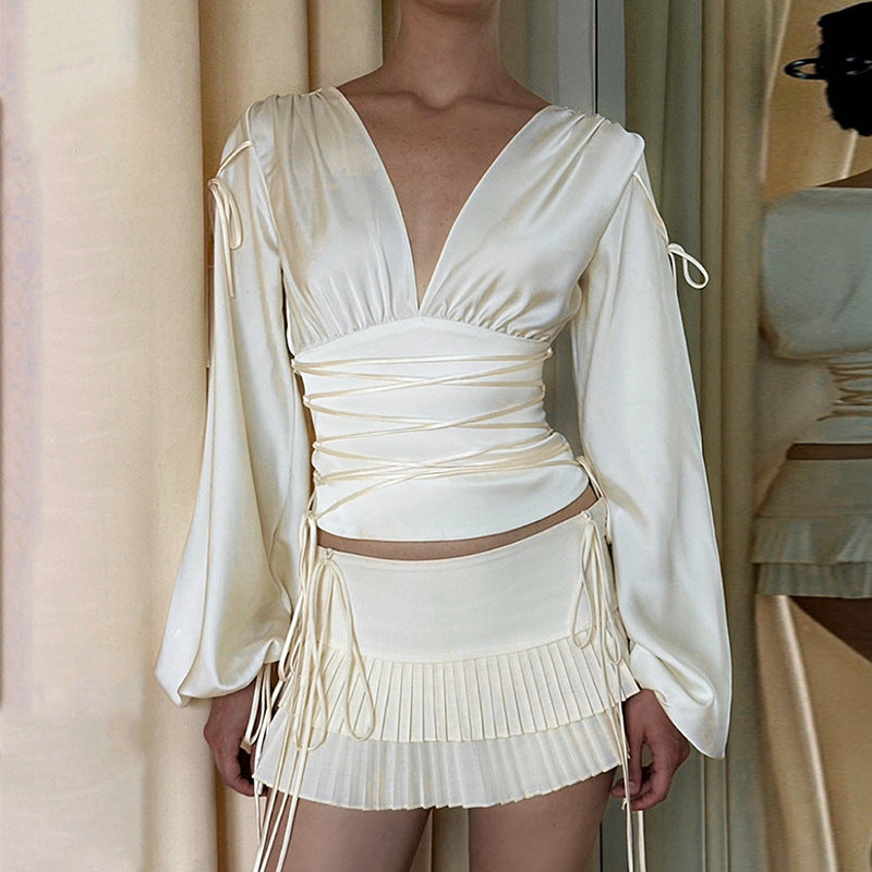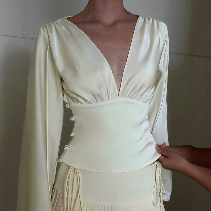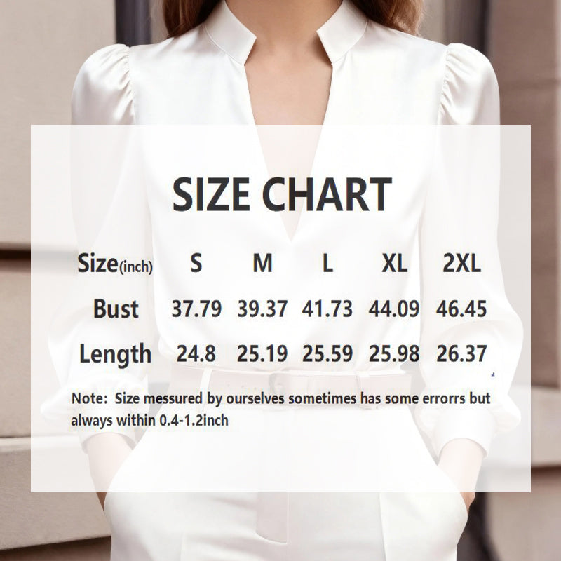 Crafted from smooth, flowing satin fabric, this top features a classic V-neckline that elongates the silhouette, complemented by sleek long sleeves. The tailored slim fit contours gracefully to your shape, offering a sophisticated look that works perfectly under blazers or stands alone as a statement piece. The solid color palette ensures easy pairing with your favorite bottoms.
